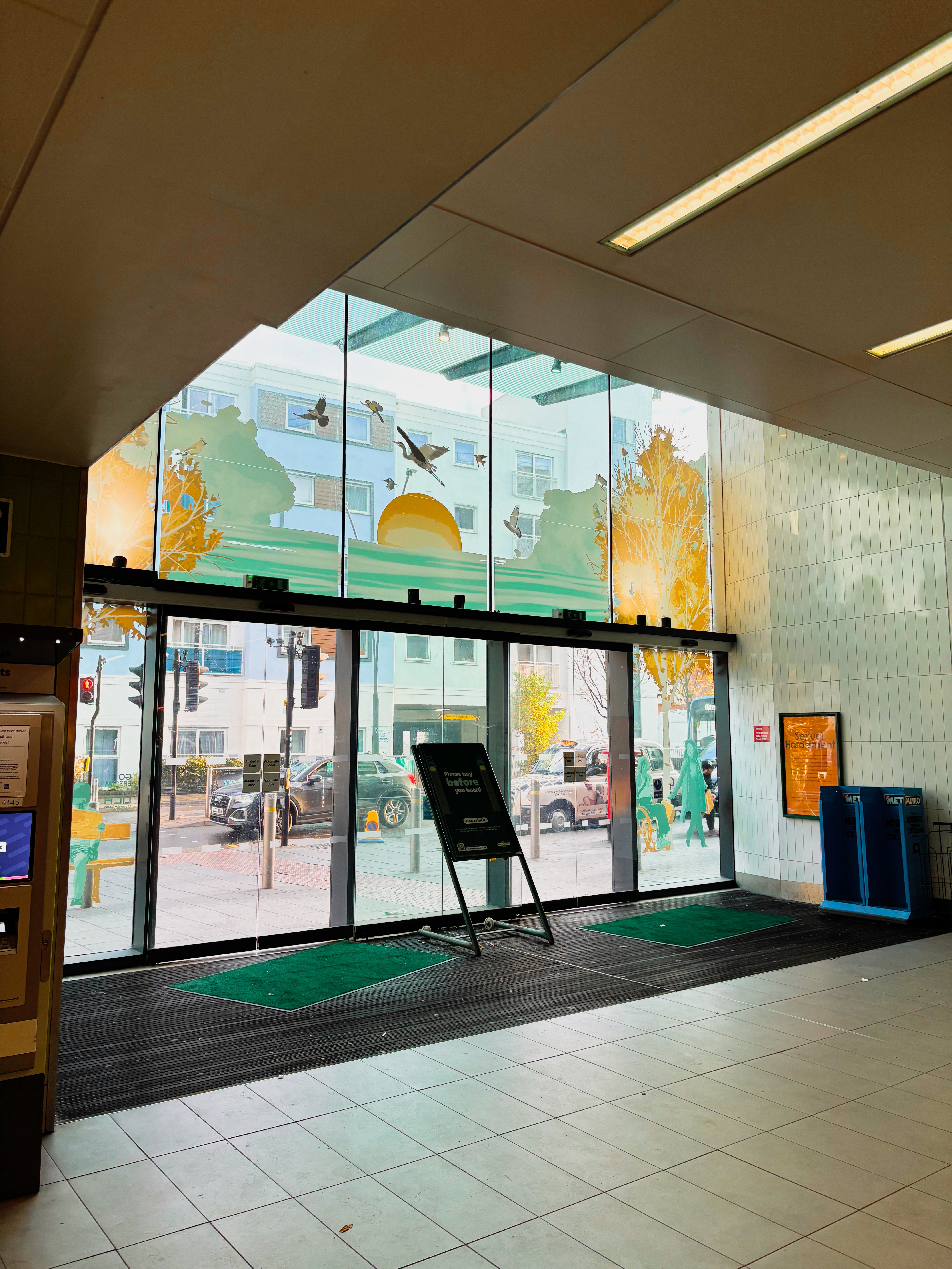 Using digitally-illustrated golden birch trees to frame the sliding doors into the station, I worked hard to make the most of the unique window space, allowing plenty of light to stream through the colourful design. As the inside of the station was clad in green tiles, I tried to avoid using green in my design — instead complimenting it by using yellow and blue colours to match with the station's exterior.